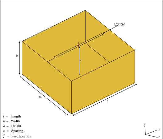 cavity объект представляет собой полостную антенну, расположенную на плоскости X-Y-Z. Полостная антенна по умолчанию имеет диполь в качестве возбудителя. Точка подачи находится на возбудителе.