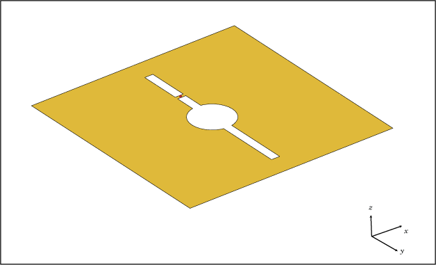 customAntennaGeometry объект представляет собой антенну, представляемую 2-D пользовательской геометрией на плоскости X-Y. Используя customAntennaGeometry, можно импортировать плоскую сетку, определить подачу для этой сетки, чтобы создать антенну, проанализировать антенну и использовать ее в конечных или бесконечных массивах. Показанное изображение представляет собой пользовательскую антенну слота.