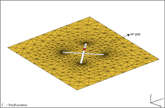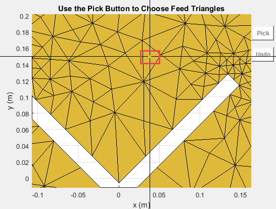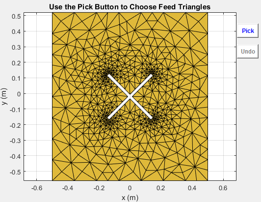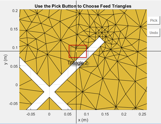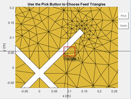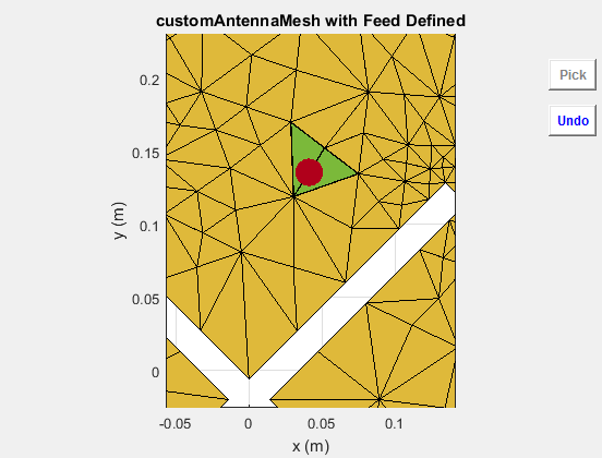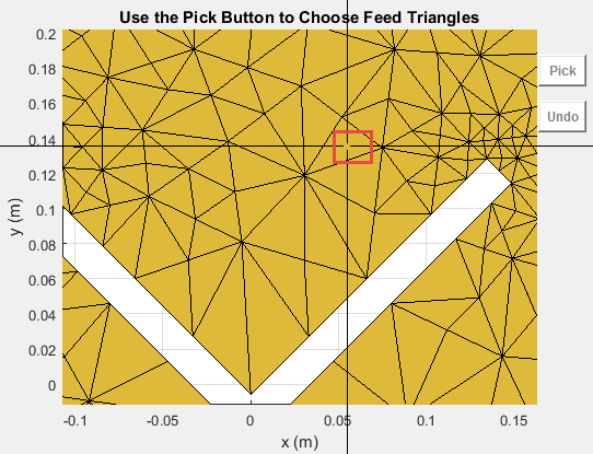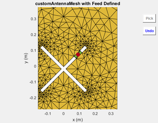 createFeed( отображает пользовательскую антенную сетку в окне рисунка. В окне рисунка можно указать расположение подачи для сетки и создать пользовательскую антенну. Чтобы задать область для точки подачи, выберите две точки, внутренние треугольники на каждой стороне воздушного зазора или внутренние треугольники, которые имеют общую кромку.antenna)