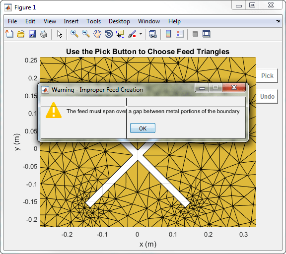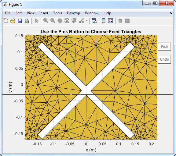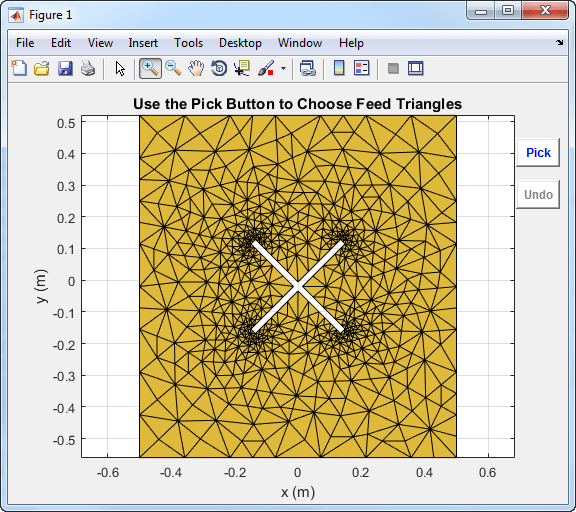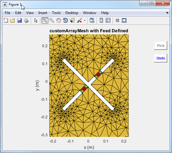 createFeed( отображает пользовательскую сетку массива в окне фигуры. В окне рисунка можно указать расположения подачи, щелкнув сетку и создав пользовательский массив. Чтобы задать область для точки подачи, выберите две пары точек внутри треугольников на каждой стороне воздушного зазора.array)