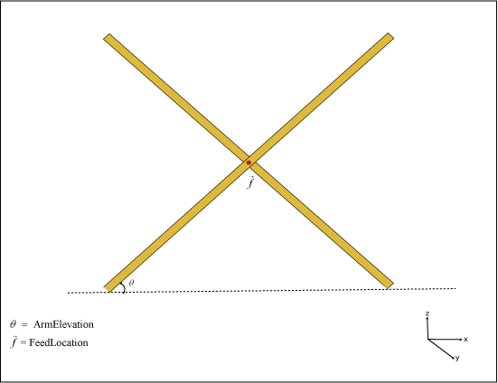 dipoleCrossed объект создает турникетную антенну. По умолчанию турникетная антенна питается от центра и находится на плоскости Y-Z. Эта антенна работает на частоте 6 ГГц. Также можно создать турникетную антенну с помощью следующих антенных элементов: bowtieTriangular, bowtieRounded, и dipoleBlade.