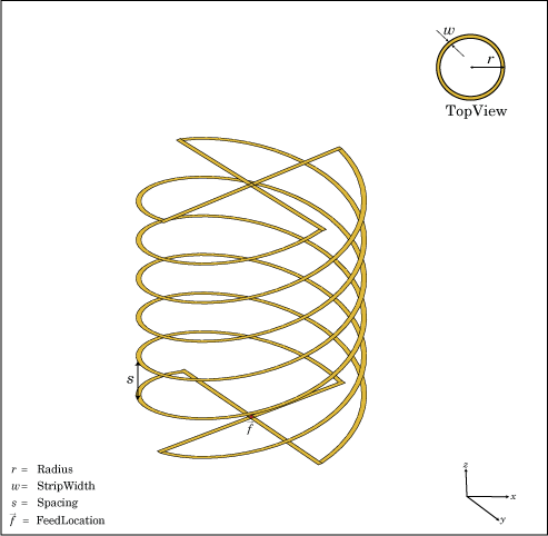 Для заданного радиуса цилиндра используйте cylinder2strip для вычисления эквивалентной ширины. Спиральная антенна по умолчанию имеет конечное питание. Круговая плоскость заземления находится на плоскости X-Y. Спиральные антенны обычно используются в осевом режиме. В этом режиме окружность спирали сравнима с рабочей длиной волны, и спираль имеет максимальную направленность вдоль своей оси. В нормальном режиме радиус спирали мал по сравнению с рабочей длиной волны. В этом режиме спираль излучает широту, то есть в плоскости, перпендикулярной её оси. Основные уравнения для спирали:
