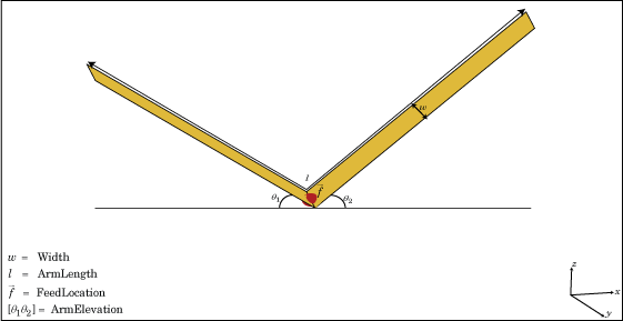 Для заданного радиуса цилиндра используйте cylinder2strip для вычисления эквивалентной ширины. V-дипольная антенна изогнута вокруг точки питания. По умолчанию V-диполь питается от центра и находится в плоскости X-Y. Точка питания V-дипольной антенны совпадает с началом координат.