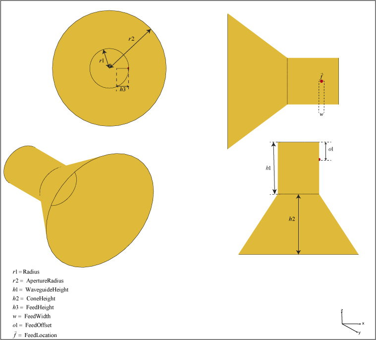 hornConical объект создает волновод в форме конуса для направления радиоволн в пучке. Этот тип рупора широко используется в качестве питающего элемента для больших радиоастрономических телескопов, спутникового слежения и коммуникационных тарелок.