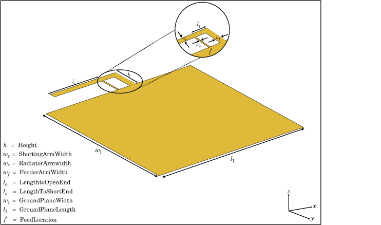 invertedFcoplanar объект представляет собой компланарную перевернутую F-антенну с прямоугольной плоскостью заземления. По умолчанию размеры выбираются для рабочей частоты 1,7 ГГц. Копланарные перевернутые F-антенны используются в RFID-тегах и приложениях Интернета вещей (IoT). Эта антенна является измененной версией перевернутой F-антенны, обеспечивая низкопрофильную антенну с большим количеством конструктивных параметров и более широкой полосой пропускания.