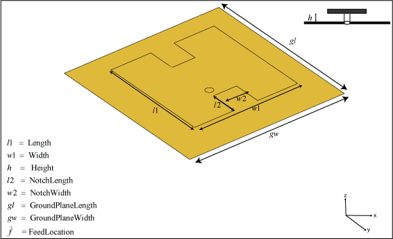 Используйте patchMicrostripHnotch создание Н-образной микрополосковой патч-антенны. Сегмент по умолчанию центрируется в начале координат с точкой подачи вдоль длины. По умолчанию размеры выбираются для рабочей частоты 3,49 ГГц для воздуха или 2,61 ГГц для тефлона.