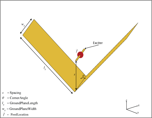 Используйте reflectorCorner создание угловой отражательной антенны. По умолчанию антенна возбудителя является диполем. Точка питания диполя находится в начале координат. Размеры по умолчанию задаются для рабочей частоты 1 ГГц.