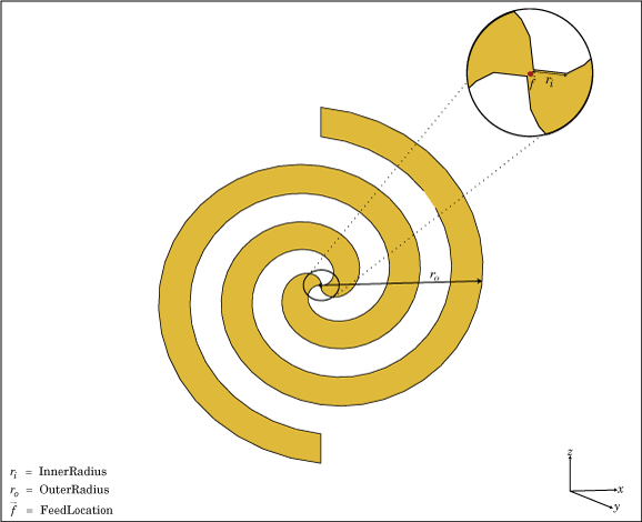 spiralArchimedean объект создает плоскую архимедовую спиральную антенну на плоскости X-Y. Архимедовая спираль по умолчанию всегда подается по центру и имеет два плеча. Полевые характеристики этой антенны не зависят от частоты. Реализуемая спираль имеет конечные ограничения на подающую область и самую внешнюю точку любого плеча спирали. Спиральная антенна проявляет широкополосное поведение. Внешний радиус накладывает низкочастотный предел, а внутренний радиус накладывает высокочастотный предел. Радиус плеча линейно растет в зависимости от угла намотки.