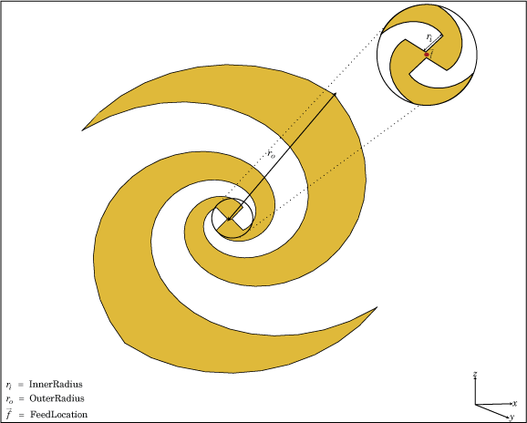 spiralEquiangular объект представляет собой плоскую равноугольную спиральную антенну на плоскости X-Y. Равноугольная спираль всегда подается по центру и имеет два плеча. Полевые характеристики антенны не зависят от частоты. Реализуемая спираль имеет конечные ограничения на подающую область и самую внешнюю точку любого плеча спирали. Эта антенна демонстрирует широкополосное поведение. Внешний радиус накладывает низкочастотный предел, а внутренний радиус накладывает высокочастотный предел. Радиус плеча линейно растет в зависимости от угла намотки. В результате внешние плечи спирали формируются таким образом, чтобы минимизировать отражения.