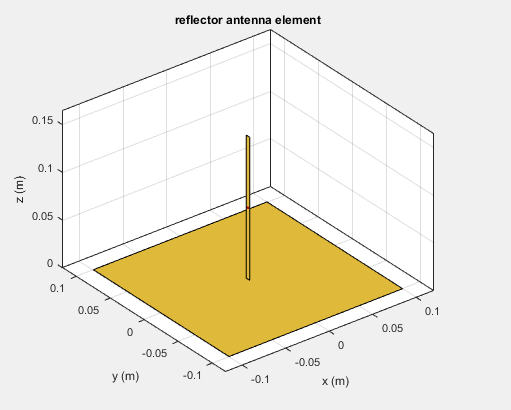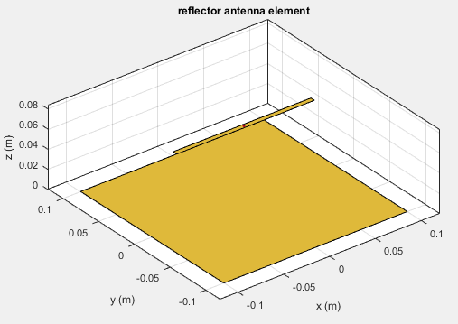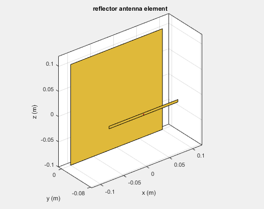 Вращение отражательного элемента вращает всю конструкцию на заданный угол. Чтобы повернуть полную антенну, используйте Tilt свойство объекта-отражателя. Например, поверните отражатель на 90 градусов относительно оси X. Согласно правому правилу, отражатель теперь лежит в плоскости X-Z с диполем.