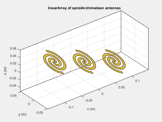 s = spiralArchimedean; l = linearArray('Element',s,'ElementSpacing',0.1,... 'NumElements',3,'Tilt',30,'TiltAxis',[1 1 0]); show(l)