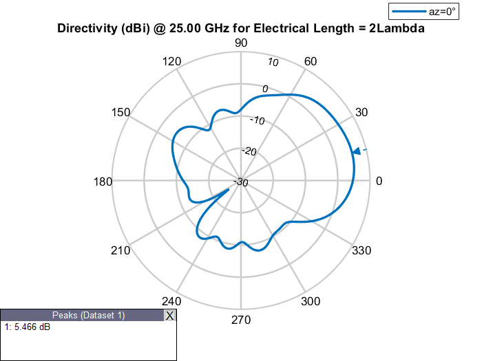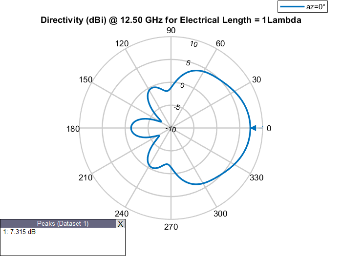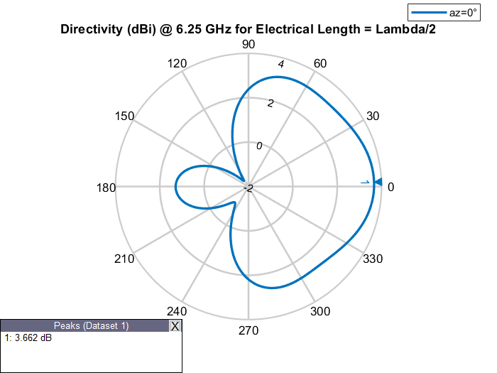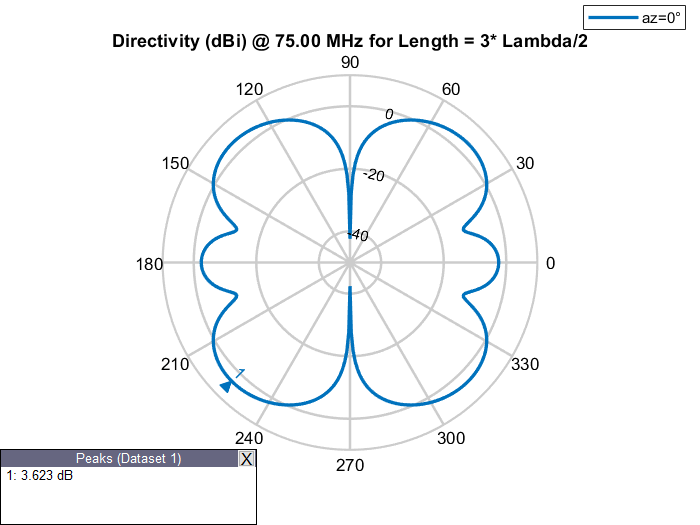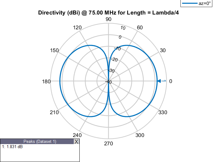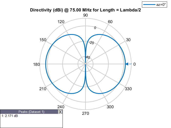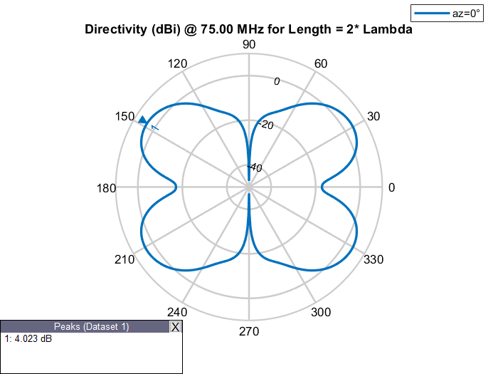 Физическая длина антенны - это фактические физические размеры антенны. Рассмотрим dipole антенна от антенного Toolbox™ с рабочей частотой 75 МГц и соответствующей длиной волны 4 м. dipole объект создает полуволновую дипольную антенну, следовательно, ее электрическая длина составляет Lambda/2 или 2 м, что равно физической длине антенны.