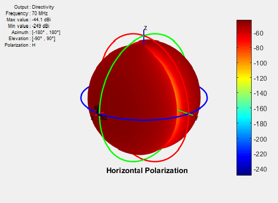 Horizontal PolarizationВектор электрического поля параллелен нулевой плоскости. Чтобы просмотреть диаграмму горизонтальной поляризации антенны, используйте pattern функция, с аргументом пары имя-значение «Поляризация», равным «H». На графике показана диаграмма горизонтальной поляризации дипольной антенны: