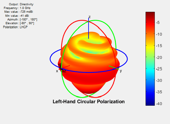 Left-Hand circularly polarized (LHCP)Вектор электрического поля отслеживается в направлении по часовой стрелке. Для просмотра диаграммы направленности LHCP антенны используйте pattern с аргументом пара имя-значение «Поляризация», установленным на «LHCP». На графике показана схема LHCP спиральной антенны: