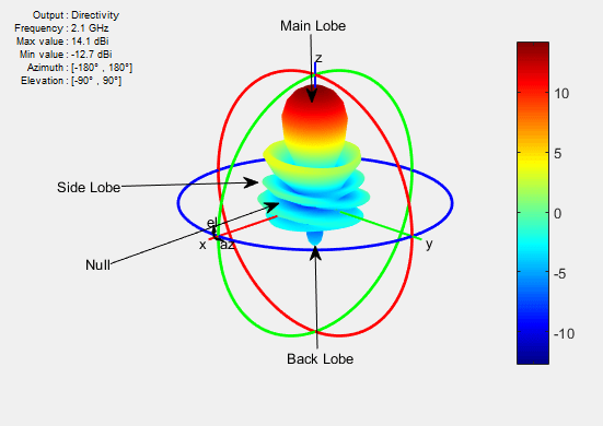 Диаграмма направленности антенны - пространственное распределение мощности. Диаграмма показывает направленность или усиление антенны. диаграмма направленности мощности антенны отображает передаваемую или принимаемую мощность для данного радиуса. Диаграмма направленности поля антенны строит график изменения электрического или магнитного поля для данного радиуса. Диаграмма направленности обеспечивает такие детали, как максимальное и минимальное значение величины поля и диапазон углов, по которым строятся данные.