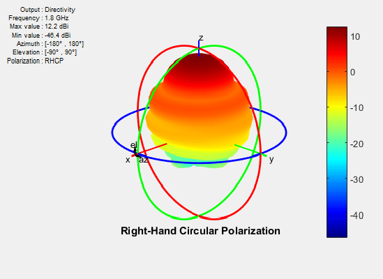 h = helix; h.Turns = 13; h.Radius = 0.025; pattern(h,1.8e9,'Polarization','RHCP')