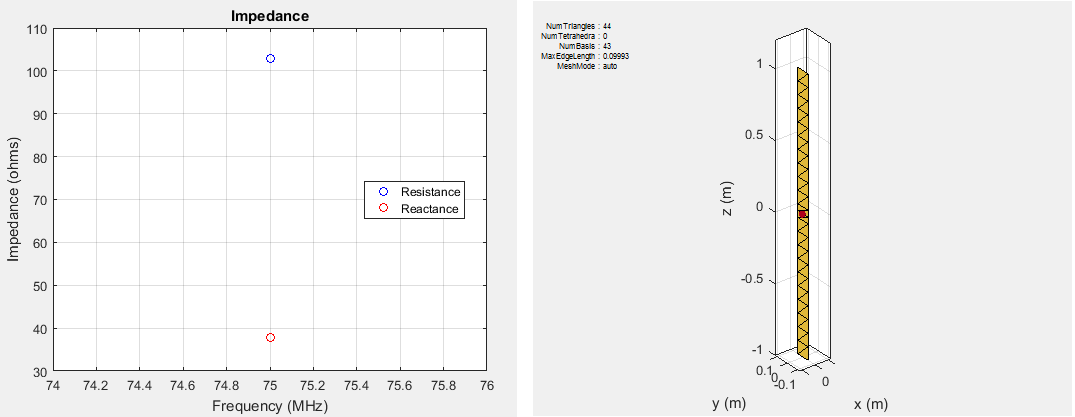 В приведенном выше примере перед вычислением импеданса при этом значении диполь автоматически входит в сеть с частотой 75 МГц. Команда mesh используется для просмотра диполя с сетками. Число треугольников - 44.