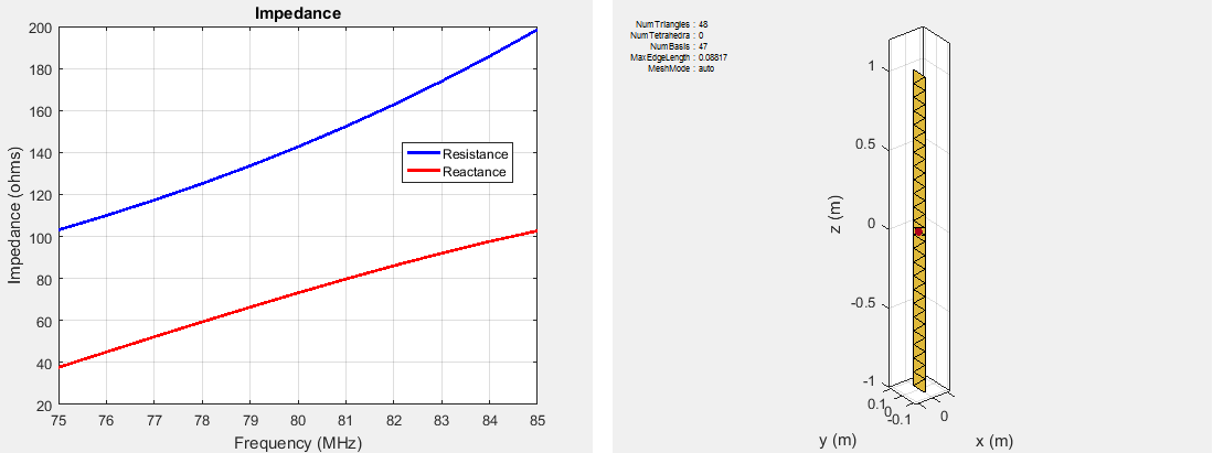d = dipole; impedance(d,75e6:1e6;85e6); mesh(d)
