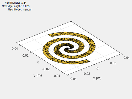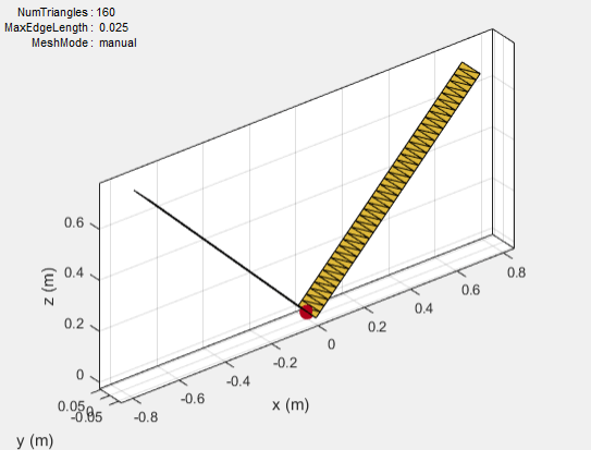 Метод моментов (МоМ) - численный метод, преобразующий непрерывные интегральные уравнения Максвелла в приближённую дискретную формулировку, требующую инверсии большой матрицы. Создание сетки - это процесс преобразования непрерывной области в дискретную область для решения уравнений. Для дискретизации поверхностей обычно используются треугольники или прямоугольники. Антенна Toolbox™ использует треугольный элемент для зацепления, так как он лучше соответствует произвольным профилированным поверхностям. Треугольники используются для аппроксимации поверхностного тока с помощью базисных функций Рао-Уилтона-Глиссона (RWG). Чтобы получить точный результат, убедитесь, что большое количество треугольников присутствует в области, где изменение тока является самым высоким. Эта область обычно является либо углами в геометрии антенны, либо в точке возбуждения антенны.