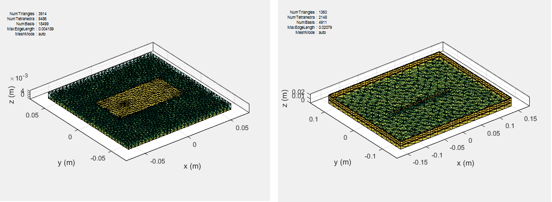 Базовые функции используются для представления неизвестных величин. В случае антенн, использующих диэлектрики, неизвестными величинами являются поверхностный ток на металлической структуре и плотность потока, обусловленная объемом диэлектрика. В Antenna Toolbox используются базовые функции Rao-Wilton-Glisson (RWG) [2]. Базовые функции для металлической конструкции в антенне см. в разделе Метод решателя моментов для металлических конструкций.
