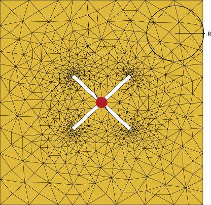 Эта область на диагонали и вокруг нее называется соседней областью. Соседняя область определяется в пределах сферы радиуса R, где R представляет собой размер треугольника. Размер треугольника - максимальное расстояние от центра треугольника до любой из его вершин. По умолчанию R в два раза превышает размер треугольника. Для лучшей точности для вычисления интегралов используется схема интегрирования более высокого порядка.