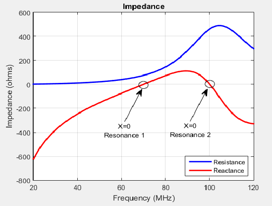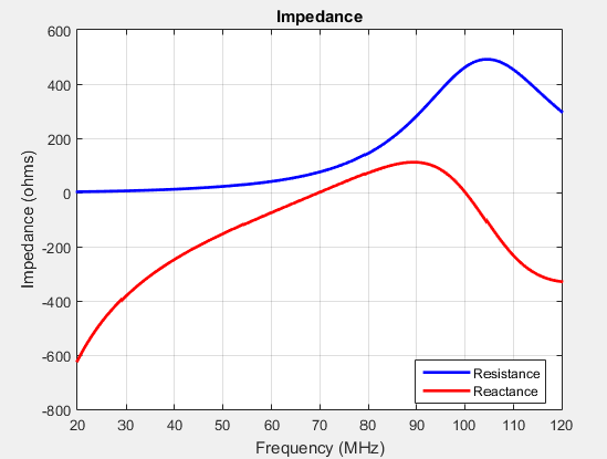 Входной импеданс антенны является частотно-зависимой величиной. На графике показан входной импеданс дипольной антенны по полосе частот 20-120 МГц. Следы сопротивления и реактивного сопротивления изменяются с частотой. Вариация может быть качественно описана с точки зрения резонансов.