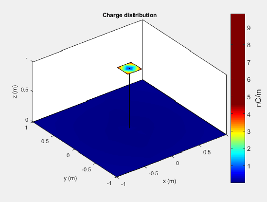 Все размеры этой антенны такие же, как у монополя. Первый резонанс антенны составляет приблизительно 45 МГц. Для просмотра накопленных зарядов на монополе верхней шляпы используйте charge функция: