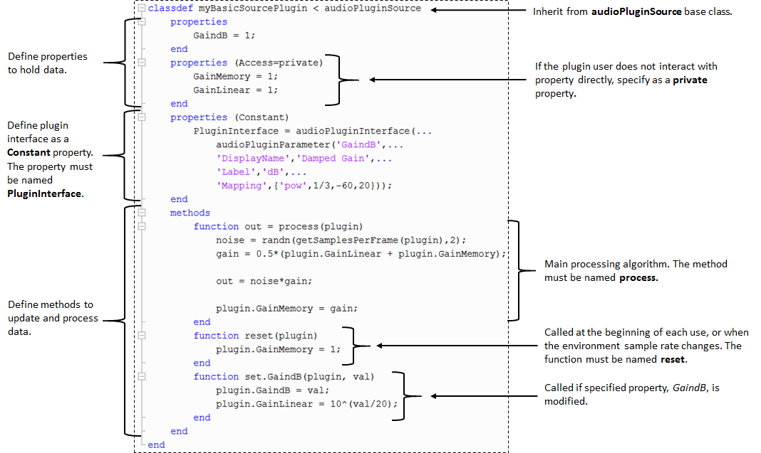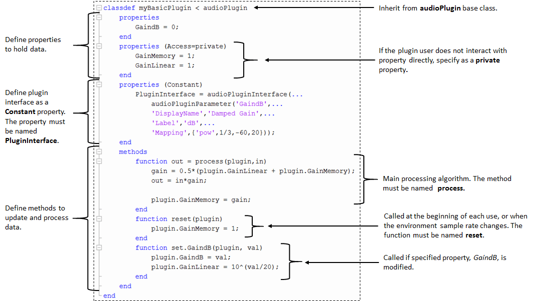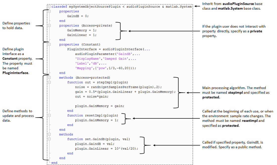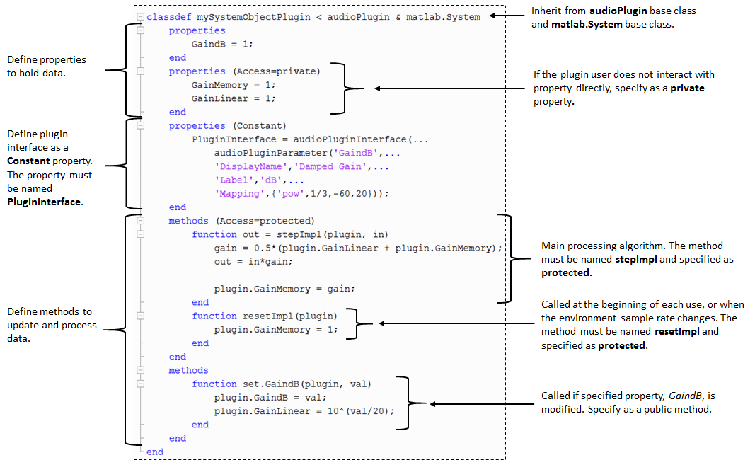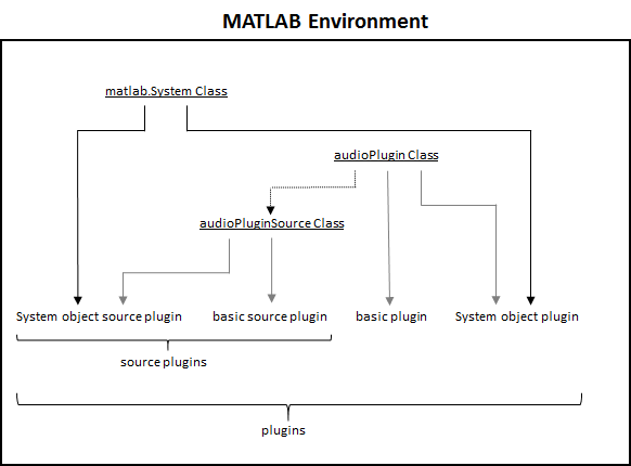 В среде MATLAB аудиоплагин относится к классу, производному от audioPlugin базовый класс или audioPluginSource базовый класс. Аудиоплагины также могут наследовать от matlab.System. Любой объект, производный от matlab.System называется системным объектом. Получение из matlab.System обеспечивает дополнительные функциональные возможности, включая интеграцию Simulink. Однако для управления системными объектами требуется более глубокое понимание ООП в среде MATLAB.