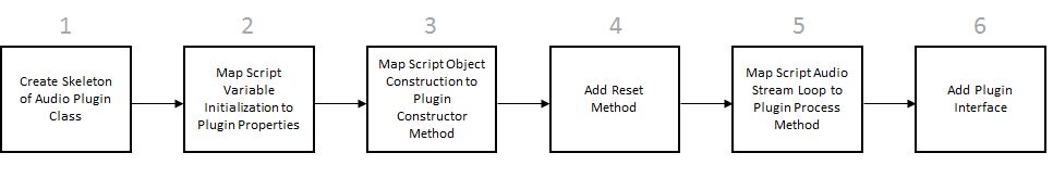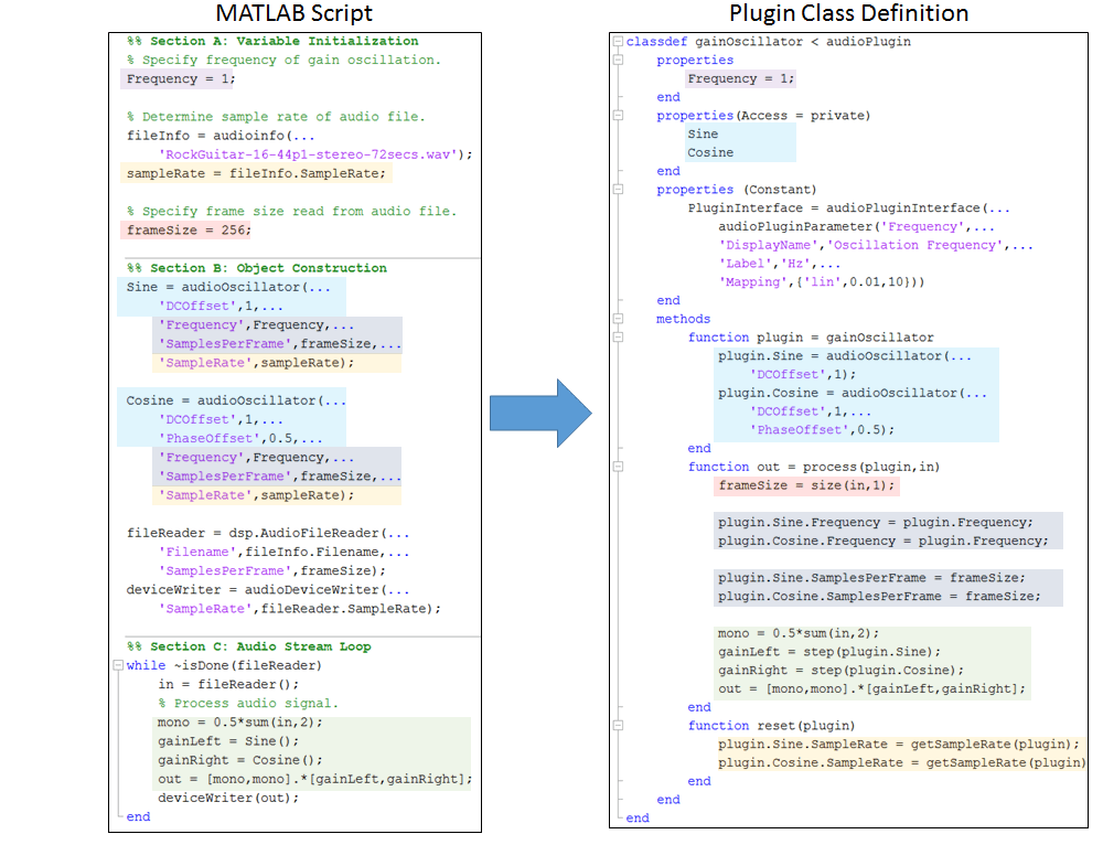 В этом учебном пособии сценарий MATLAB преобразуется в класс аудиоплагинов за шесть шагов. Сначала необходимо создать скелет базового класса аудиоплагинов, а затем сопоставить разделы сценария MATLAB с классом аудиоплагинов.