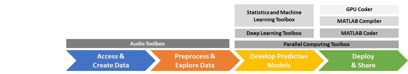 В то время как Audio Toolbox™ поддерживает каждый этап процесса глубокого обучения, его основным вкладом является доступ и создание данных, а также предварительная обработка и изучение данных.