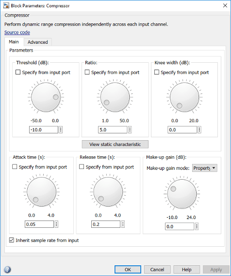 Откройте интерфейс пользователя параметров блока, дважды щелкнув блок. Параметры можно изменять во время выполнения модели. Например, при добавлении блока «Компрессор» можно настроить набор пороговых значений (дБ) для сжатия динамического диапазона звукового сигнала.