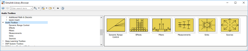 Библиотека блоков Audio Toolbox имеет шесть категорий: Динамический контроль диапазона, Эффекты, Фильтры, Измерения, Раковины и Источники. Выберите блок из одной из категорий и добавьте его в модель.