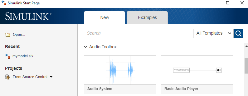 Чтобы создать модель с помощью шаблонов модели Simulink панели инструментов Audio Toolbox, выполните следующие действия.