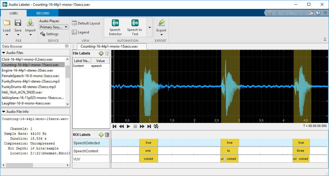 Откройте приложение Audio Labeler и загрузите KeywordSpeech-16-16-mono-34secs.flac в браузере данных.