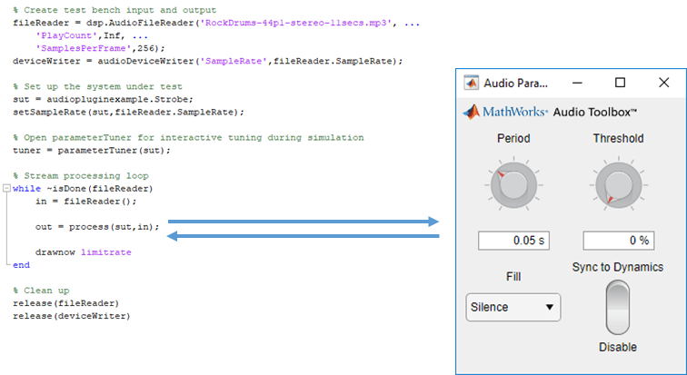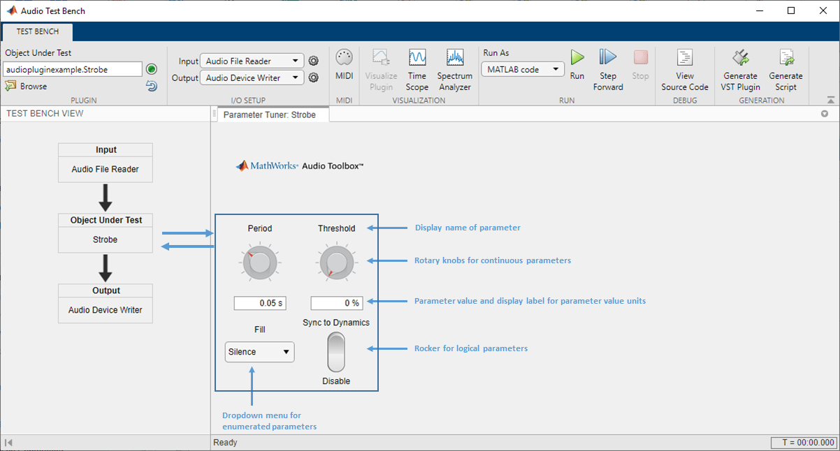 Среда MATLAB с использованием аудиотестирования. Используйте Audio Test Bench для взаимодействия с параметрами плагина в среде MATLAB в полном рабочем процессе на основе графического интерфейса пользователя. Используя Audio Test Bench, вы можете указать вход и выход звука, проанализировать ваш плагин с помощью областей времени и частотной области, подключиться к элементам управления MIDI, а также проверить и создать ваш плагин. Стенд аудиотестирования соответствует графическому пользовательскому интерфейсу, указанному в audioPluginParameter, audioPluginGridLayout, и audioPluginInterface (кроме кинопленок).