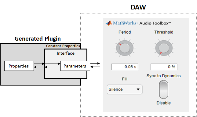 В среде цифровой звуковой рабочей станции (DAW) или при использовании Audio Test Bench или parameterTuner В среде MATLAB ® параметры подключаемых модулей настраиваются, обращенные к пользователю значения с определенными диапазонами, сопоставленными с элементами управления. При изменении значения параметра с помощью элемента управления соответствующее свойство подключаемого модуля также изменяется. Если алгоритм обработки звука плагина зависит от свойств, алгоритм также изменяется.