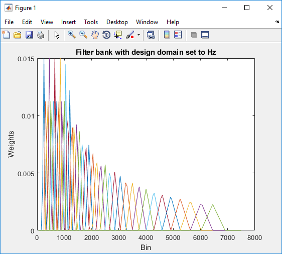 FilterBankDesignDomain - Домен для проектирования банка фильтров mel'Hz' (по умолчанию) | 'Bin'Домен для проектирования банка фильтров, указанный как 'Hz' или 'Bin'. Блок фильтров выполнен в виде перекрывающихся треугольников с кромками полос, определенными BandEdges собственность.