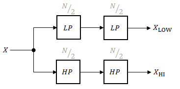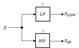LP и HP являются фильтрами Butterworth порядка N, реализуемыми в виде транспонированных секций второго порядка прямой формы II. Общая частота отсечки, используемая в их конструкции, соответствует пересечению полученных полос.