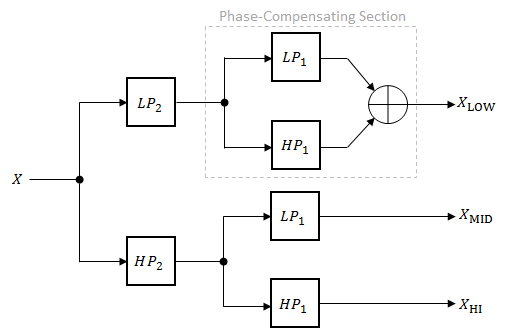 Четные трехполосные (два кроссовера) фильтры реализуются как параллельные комплементарные фильтры верхних и нижних частот, организованные в древовидной структуре.