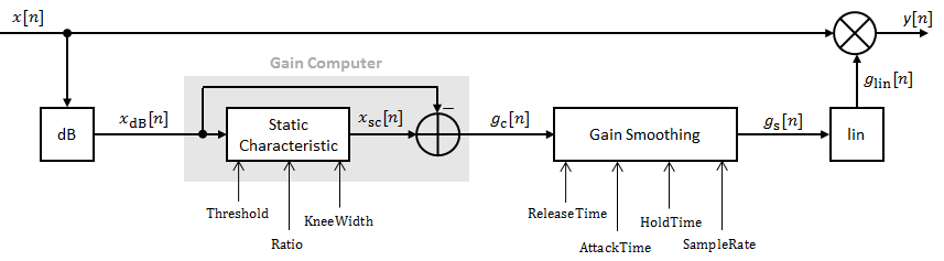 Предполагая жесткую коленную характеристику и установившийся входной сигнал, такой что x [n] дБ <thresholdValueкоэффициент расширения определяется как [n] − T).