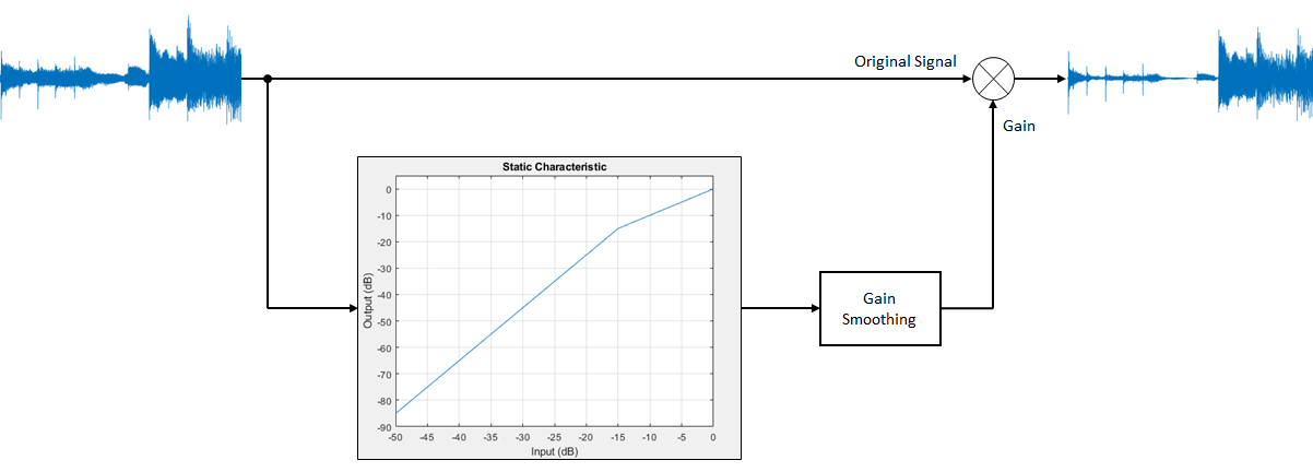frameLength = 1024; fileReader = dsp.AudioFileReader('Counting-16-44p1-mono-15secs.wav', ... 'SamplesPerFrame',frameLength); deviceWriter = audioDeviceWriter('SampleRate',fileReader.SampleRate); dRE = expander(-40,10, ... 'AttackTime',0.01, ... 'ReleaseTime',0.02, ... 'HoldTime',0, ... 'SampleRate',fileReader.SampleRate); visualize(dRE)