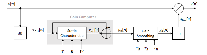 xdB [n] проходит через компьютер усиления. Компьютер усиления использует статические характеристические свойства динамического расширителя диапазона для ослабления усиления, которое ниже порогового значения.
