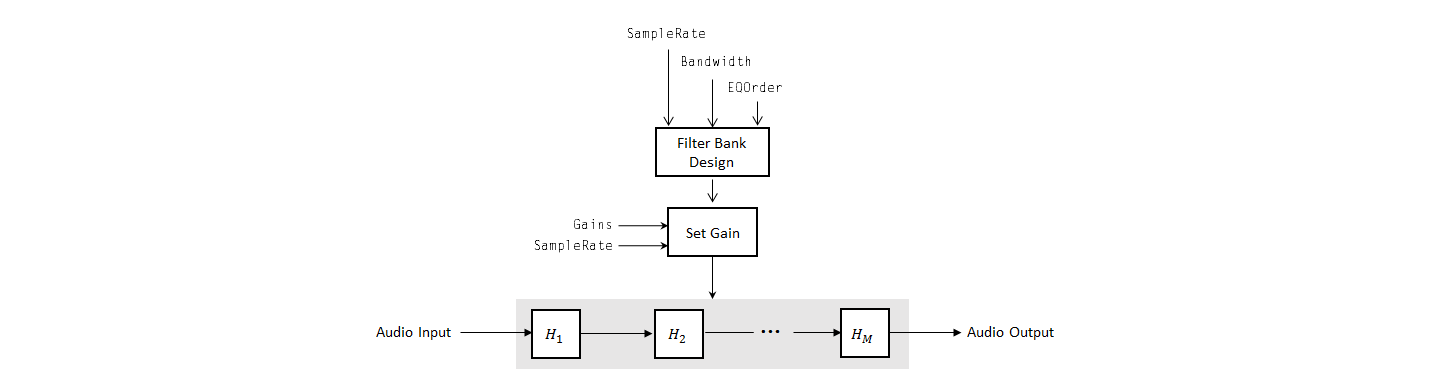 equalizer = graphicEQ('Structure','Parallel','EQOrder','1/3 octave') создает объект System, equalizer, которая реализует фильтрацию с использованием параллельной структуры и полосы пропускания фильтра в одну треть октавы.Чтобы использовать функцию объекта, укажите объект System в качестве первого входного аргумента. Например, для освобождения системных ресурсов объекта System с именем obj, используйте следующий синтаксис: