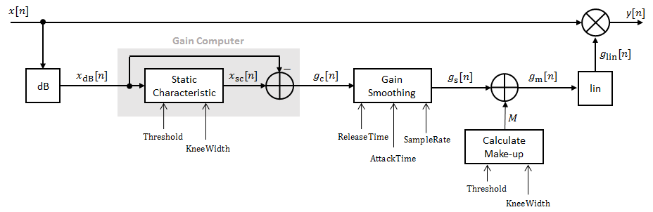 xdB [n] проходит через компьютер усиления. Компьютер усиления использует статические характеристические свойства ограничителя динамического диапазона для усиления кирпичной стены, которое выше порогового значения.