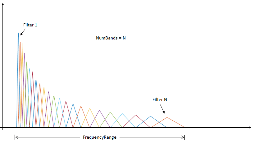 Набор фильтров mel выполнен в виде половинно перекрывающихся треугольных фильтров, равноудаленных по шкале mel. NumBands управляет количеством полосовых фильтров. FrequencyRange управляет краями полосы первого и последнего фильтров в наборе фильтров mel. FilterBankNormalization определяет тип нормализации, применяемой к отдельным полосам данных.