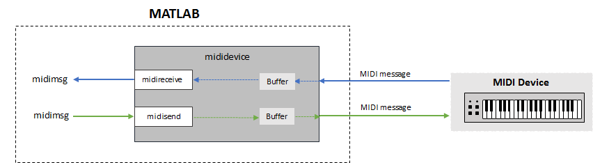 Интерфейс с устройством MIDI в MATLAB ® с использованиемmididevice. Упаковка MIDI-сообщений с использованием midimsg. Отправка и получение сообщений с помощью midisend и midireceive. Использовать mididevinfo для запроса доступных устройств MIDI в системе.