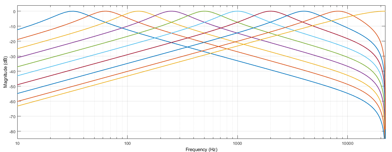 octaveFilterBank разлагает сигнал на октавные или дробно-октавные поддиапазоны. Октавная полоса - это полоса частот, где наибольшая частота вдвое превышает наименьшую частоту. Октавные и дробные октавные фильтры обычно используются для имитации того, как люди воспринимают громкость.