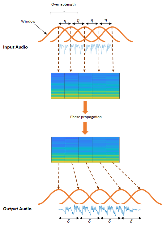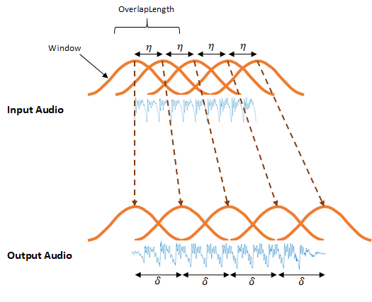 Алгоритм WSOLA является временным подходом к [1][2] TSM. WSOLA является расширением алгоритма наложения и добавления (OLA). В алгоритме OLA сигнал временной области окошивается с интервалом start, где η = numel(. Для построения модифицированного во временном масштабе выходного звука окна разнесены на интервал δ, где δ ≈ start/α. α - коэффициент TSM, определяемый Window) - OverlapLengthalpha входной аргумент.