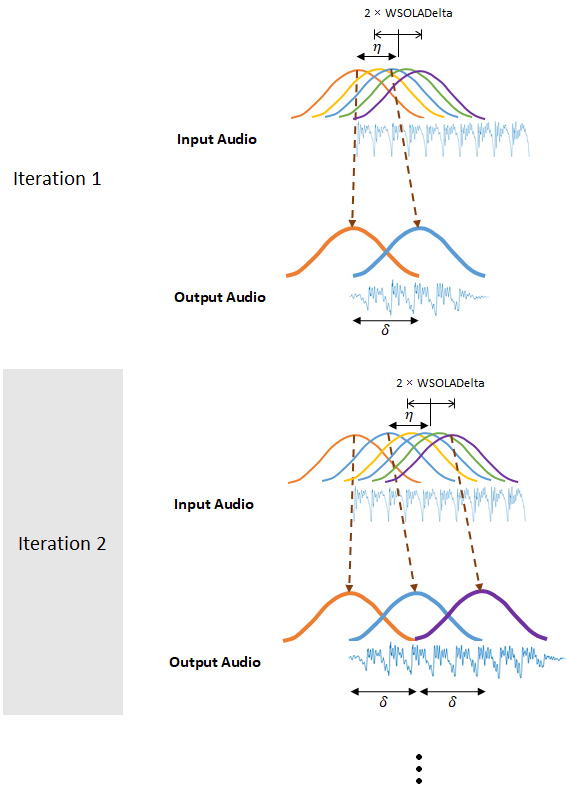 Алгоритм OLA хорошо справляется с воссозданием спектров величин, но может вводить фазовые переходы между окнами. Алгоритм WSOLA пытается сгладить фазовые переходы путем поиска WSOLADelta отсчеты вокруг интервала startдля окна, которое минимизирует фазовые переходы. Алгоритм ищет лучшее окно итеративно, так что каждое последовательное окно выбирается относительно ранее выбранного окна.