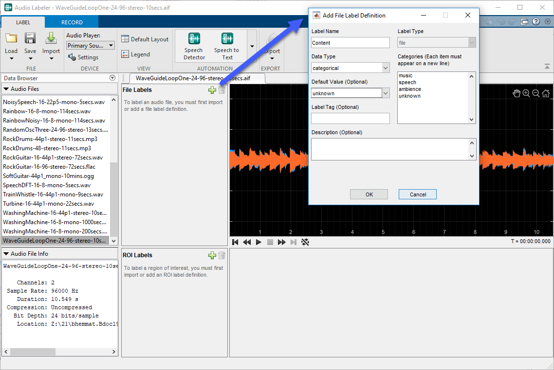 Укажите имя метки как Content, тип данных как categoricalи Категории как music, speech, ambience, или unknown. Задайте значение по умолчанию для определения метки, равное unknown.